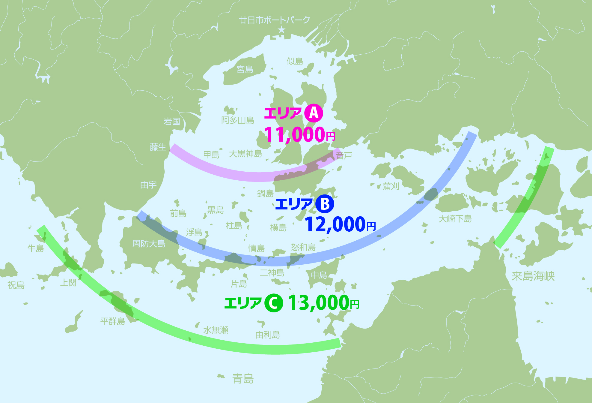 Aエリア 66,000円〜 Bエリア 72,000円〜 Cエリア 78,000円〜 ※下記エリアマップを参照ください。 ・ジギング(青物) ・カワハギ ・アコウ ・タイラバ(真鯛) ・ライトジギング ・メバル(サビキ釣り) ・タチウオ(テンヤなど) ・アオリイカ(ティップラン) ほか 6名を超える場合は、1名増えるごとにエリア料金を加算させていただきます。 ※下記注意事項もご確認ください。
